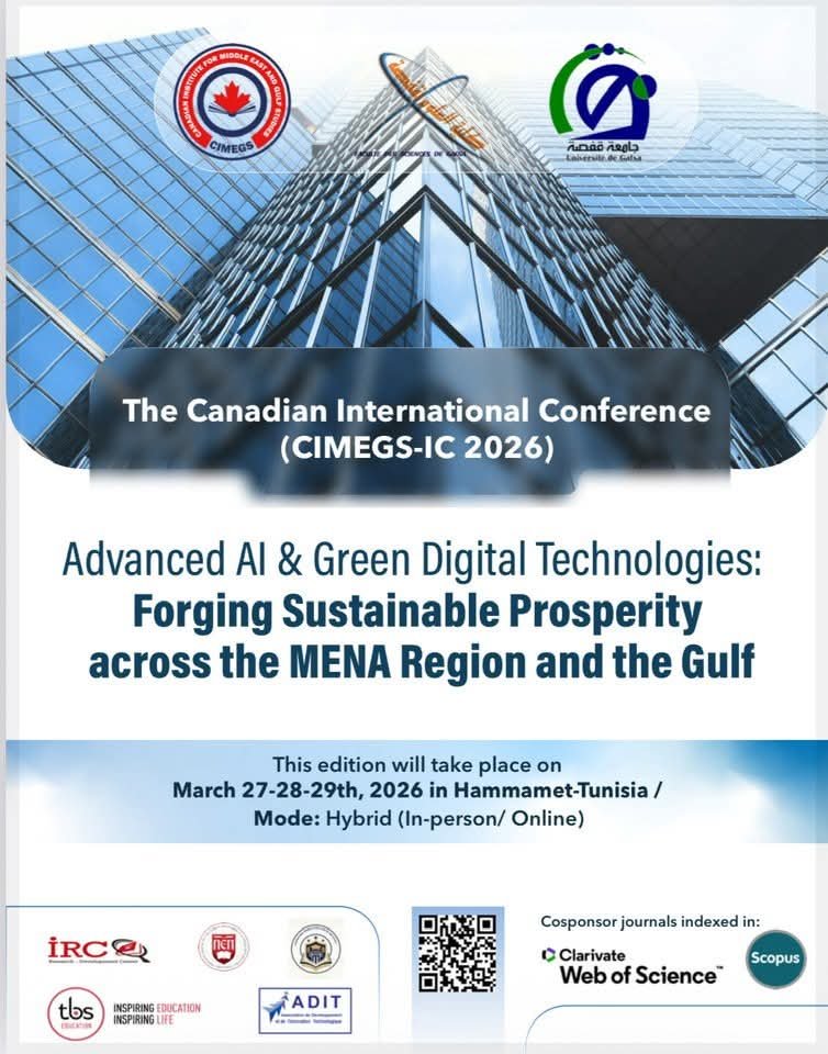 Hybrid Event (In-person & Online) Canadian International Conference on Advanced AI & Green Digital Technologies (CIMEGS-IC 2026) 📅 March 27 – 29, 2026 📍 Hammamet, Tunisia The Canadian Institute for Middle East and Gulf Studies (CIMEGS), in collaboration with the Faculty of Sciences at the University of Gafsa, is pleased to invite you to this ... Read more